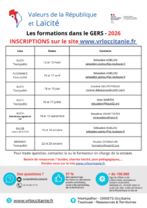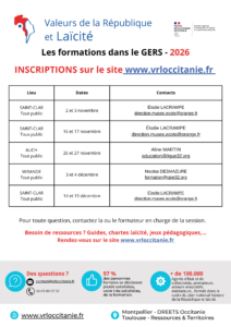 Formation Valeurs de la République et Laïcité 2026 A la une, Éducation / Formation, Non classé 17 février 202617 Fév, 2026 Ligue de l'Enseignement du Gers Partager Envoyer l'article par e-mail Imprimer cet article